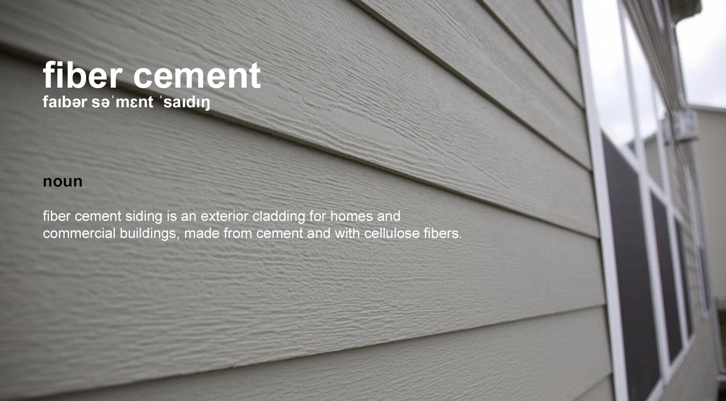 Noun: Fiber cement siding is an exterior cladding for homes and commercial buildings, made from cement and with cellulose fibers.